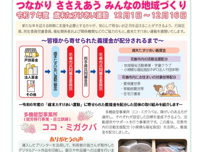 続きを読む12月1日発行の「はなまき社協情報」に、ココ・ミガクバの取り組みが掲載されました。 これは、令和6年度の「歳末たすけあい運動」に寄せられた義援金の配分で、プリンターを導入させていただいたことがきっかけです。ご支援いただき …