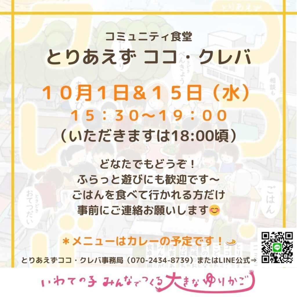 日程は予定通り、10/18(土)12~15時となります。相談支援専門員や傾聴ボランティアさんもいますので、はじめての方もお気軽にどうぞ。