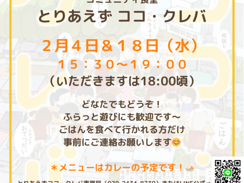 コミュニティ食堂『とりあえずココ・クレバ』 2月は変更なく、第1・第3水曜、2/4(水)と18(水)の開催となります😊 わかば学童クラブに通っている場合はスタッフがお迎えにあがることもできます。お気軽にLINEでメッセー …